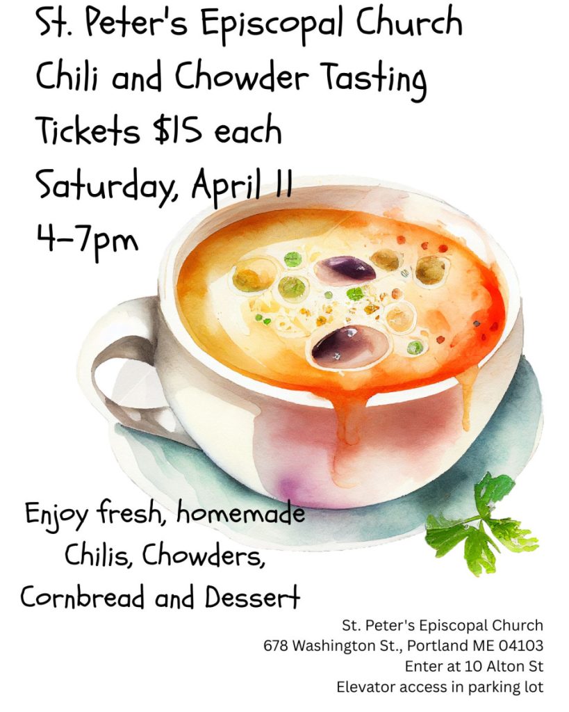 On Saturday, April 11th from 4 to 7 PM, delicious homemade chili and chowder will be served with cornbread, and dessert. Admission will be $15. We would be blessed by your presence.