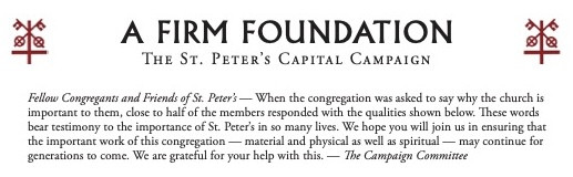 Donations to the work of St. Peter’s are always welcome. St. Peter’s welcomes contributions to support its mission in serving God through worship and service to the community. Some members make annual pledges to support the work of the parish, and all contributions of any amount are welcome.